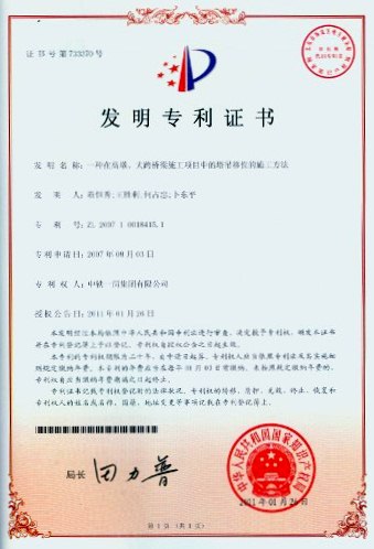 由我公司自主研發的“一種在高墩、大跨橋梁施工項目中的塔吊移位的施工方法”獲得國家知識產權局發明專利授權。
