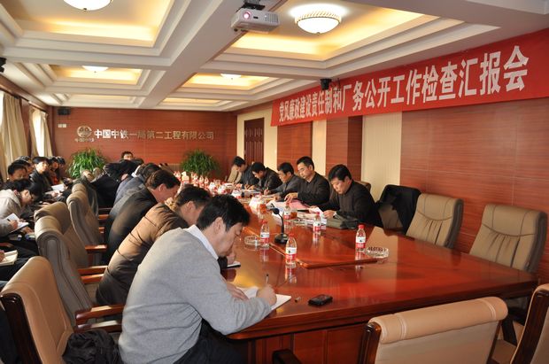 在聽取完匯報之后,集團(tuán)公司紀(jì)委副書記、監(jiān)察部部長王永江、工會勞動保障女工部部長張方分別通報了黨風(fēng)廉政建設(shè)及廠務(wù)公開檢查情況。隨后集團(tuán)公司工會主席、副總經(jīng)理曹根子做了重要講話。曹主席首先對二公司的黨風(fēng)廉政建設(shè)及廠務(wù)公開工作給予了充分肯定,他總結(jié)二公司黨風(fēng)廉政建設(shè)暨廠務(wù)公開工作的四個特點(diǎn):一是領(lǐng)導(dǎo)重視,認(rèn)識到位;二是健全制度,強(qiáng)化監(jiān)督;三是分工明確,責(zé)任落實(shí);四是加強(qiáng)考核,獎罰分明。接著他對二公司黨風(fēng)廉政建設(shè)暨廠務(wù)公開工作提出了“六抓”的要求,一抓教育;二抓基本;三抓關(guān)鍵;四抓規(guī)范;五抓考核;六抓責(zé)任落實(shí)。之后曹主席結(jié)合當(dāng)前的形勢,對二公司下一步工作提出八個方面意見:一是要抓好十八大精神學(xué)習(xí)貫徹;二是要落實(shí)區(qū)域化經(jīng)營,積極拓展和鞏固市場;三是要總結(jié)項(xiàng)目管理經(jīng)驗(yàn),提高經(jīng)濟(jì)效益;四是要高度重視醫(yī)療保險,維護(hù)職工利益和企業(yè)穩(wěn)定;五是要關(guān)心職工生活,提高收入水平;六是要重視協(xié)作隊(duì)伍和農(nóng)民工的管理;七是要注重人才培養(yǎng)與選拔;八是要加強(qiáng)職工隊(duì)伍建設(shè)。最后,曹主席殷切的希望二公司全體黨員領(lǐng)導(dǎo)干部團(tuán)結(jié)一致,努力創(chuàng)造新的輝煌。