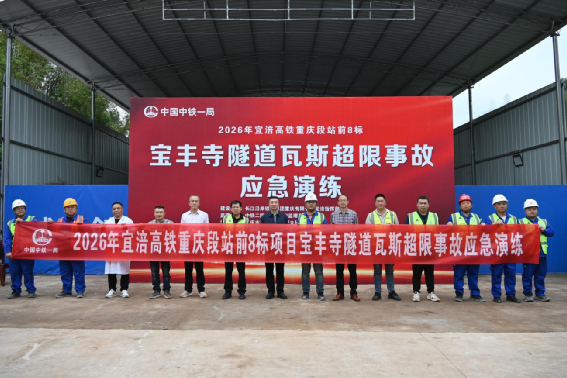 4月7日下午,中鐵一局宜涪高鐵重慶段站前8標項目聯合重慶市天府應急救援大隊、長壽區人民醫院、中鐵二院(成都)咨詢監理有限公司、誠合瑞正風險管理咨詢有限公司,在寶豐寺隧道斜井施工現場開展瓦斯超限事故應急救援演練。長江沿岸鐵路集團重慶有限公司宜涪指揮部指揮長楊偉東、重慶市天府應急救援大隊隊長謝奎、中鐵一局宜涪高鐵項目負責人李海鵬及相關協辦單位人員參加活動。