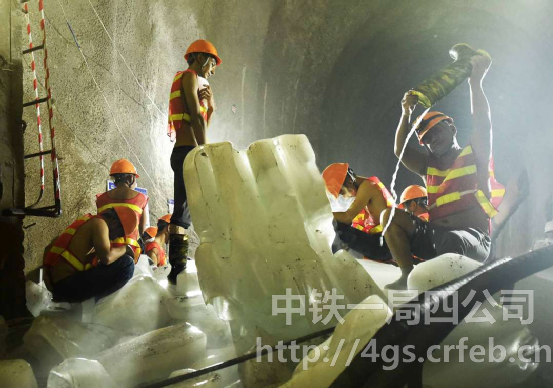 隧道的高地?zé)崾故┕きh(huán)境達(dá)到41攝氏度,工人們在冰塊上休息,輪換作業(yè)。