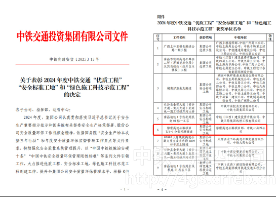 近日,公司?黎霍高速項目TJ5-1分部問腰隧道榮獲2024年度中鐵交通“安全標準工地”稱號。這一榮譽不僅是對項目安全管理工作的高度認可,更是對全體建設者不懈努力的最佳褒獎。