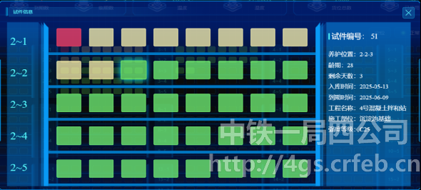試件檢測、智能預(yù)警。為了提升試驗檢測工作效率,確保工程實體質(zhì)量,項目部推廣應(yīng)用標(biāo)養(yǎng)室智能預(yù)警系統(tǒng)。該系統(tǒng)不只是簡單的溫濕度數(shù)據(jù),還包括試件對應(yīng)的施工部位、存放位置、養(yǎng)護(hù)齡期等完整信息。當(dāng)試件達(dá)到檢測齡期時,系統(tǒng)會通過顏色變化和語音播報進(jìn)行雙重提醒。這套智能養(yǎng)護(hù)系統(tǒng)降低了試件養(yǎng)護(hù)過程中的人為失誤風(fēng)險,為工程質(zhì)量控制提供了有力保障。