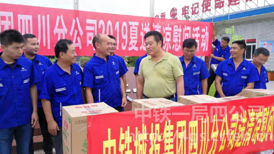 8月3日,中鐵城投集團四川分公司副總經理、工會主席張志興帶隊到中鐵一局自貢項目部進行2019“夏送清涼”慰問活動,代表分公司領導對在高溫下堅持一線生產的中鐵一局員工進行慰問并發放防暑降溫用品。