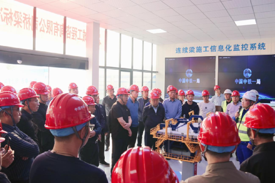 觀摩團(tuán)首先走進(jìn)江東特大橋43號(hào)墩施工現(xiàn)場(chǎng),項(xiàng)目負(fù)責(zé)人簡(jiǎn)要介紹項(xiàng)目整體概況。在智慧造橋機(jī)監(jiān)控中心,觀摩團(tuán)對(duì)照3D實(shí)體模型,詳細(xì)了解了智慧造橋機(jī)在施工精度控制、結(jié)構(gòu)穩(wěn)定性監(jiān)測(cè)及自動(dòng)化作業(yè)等方面的創(chuàng)新應(yīng)用,直觀感受了智慧造橋機(jī)在質(zhì)量安全管控、施工流程優(yōu)化中的成效。智慧造橋機(jī)在縮減人工投入、強(qiáng)化安全防護(hù)、提升施工效率等方面的突出優(yōu)勢(shì),讓觀摩人員真切體會(huì)到科技創(chuàng)新為鐵路橋梁建設(shè)帶來的新變革。隨后,觀摩團(tuán)實(shí)地察看橋梁“五小四新”應(yīng)用成果,圍繞橋梁施工質(zhì)量安全管控要點(diǎn)、技術(shù)創(chuàng)新思路展開交流。觀摩團(tuán)還前往連續(xù)梁梁面,細(xì)致了解先進(jìn)工藝工裝的落地情況,現(xiàn)場(chǎng)氛圍熱烈。交流觀摩過程中,與會(huì)人員圍繞智慧造橋機(jī)實(shí)操應(yīng)用、標(biāo)準(zhǔn)化施工流程優(yōu)化、工藝工裝革新升級(jí)等展開熱烈研討,對(duì)項(xiàng)目部橋梁標(biāo)準(zhǔn)化建設(shè)成果和智慧造橋機(jī)應(yīng)用實(shí)效給予了充分肯定。