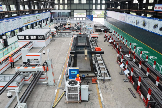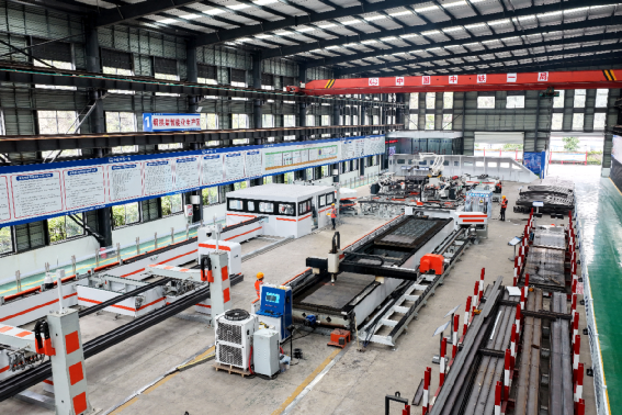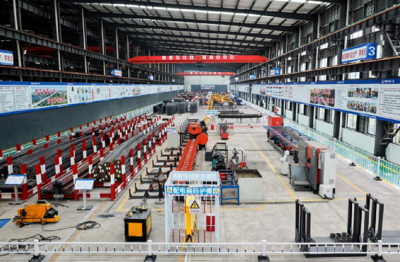 精細(xì)管理,科學(xué)布局。建設(shè)之初,面對(duì)項(xiàng)目管段隧道施工里程占比高,鋼結(jié)構(gòu)加工任務(wù)重的特點(diǎn)。項(xiàng)目部超前謀劃,堅(jiān)持科技領(lǐng)航,經(jīng)過(guò)方案比選、實(shí)地考察,在長(zhǎng)陽(yáng)土家族自治縣長(zhǎng)陽(yáng)大道投建一座7500平方米的現(xiàn)代化廠房——鋼構(gòu)件加工中心,賦能宜涪高鐵建設(shè)。該鋼結(jié)構(gòu)智慧中心,建設(shè)規(guī)模約為常規(guī)鋼構(gòu)件加工中心的3至4倍,每年可加工7875噸鋼材。走進(jìn)這座智慧加工中心,可見(jiàn)這里科學(xué)劃分為五大核心區(qū)域——鋼筋原材存放區(qū)、智能化加工區(qū)、半成品暫存區(qū)、成品倉(cāng)儲(chǔ)區(qū)及環(huán)保廢料處理區(qū),實(shí)現(xiàn)了鋼構(gòu)件全流程標(biāo)準(zhǔn)化作業(yè)。