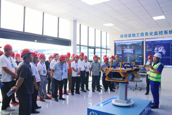 在江東特大橋43#墩智慧造橋機(jī)施工現(xiàn)場(chǎng),交流團(tuán)一行首先觀看了工藝工裝和智慧造橋機(jī)應(yīng)用專題匯報(bào)視頻。項(xiàng)目技術(shù)負(fù)責(zé)人通過“3D模型和信息化系統(tǒng)可視化演示”,詳細(xì)介紹智慧造橋機(jī)在施工精度控制、結(jié)構(gòu)穩(wěn)定性監(jiān)測(cè)及自動(dòng)化作業(yè)等方面的創(chuàng)新應(yīng)用;隨后,交流團(tuán)實(shí)地察看橋梁“五小四新”應(yīng)用成果,近距離觀察智慧造橋機(jī)承重桿件等組成部分,對(duì)項(xiàng)目團(tuán)隊(duì)在工藝工裝創(chuàng)新應(yīng)用、智慧化建造探索等方面的工作給予高度評(píng)價(jià)。