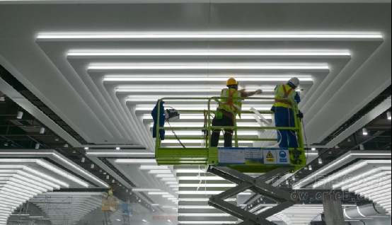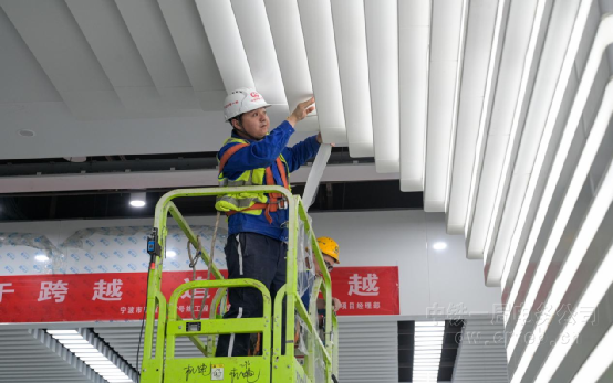 在負(fù)一樓的車站大廳,各項(xiàng)作業(yè)的工人們?nèi)蔽溲b,在花火四濺的高溫環(huán)境下持續(xù)作業(yè)。遠(yuǎn)處成槽機(jī)和近處鋼筋焊接聲此起彼伏,一片熱火朝天的大干景象。偌大的站廳內(nèi),負(fù)責(zé)裝修的工人師傅們正在進(jìn)行高處吊頂作業(yè)。只見(jiàn)他們精準(zhǔn)測(cè)量、仔細(xì)安裝,一塊塊吊頂板材在他們手中被有序拼接,逐漸構(gòu)建出平整美觀的頂部造型。與此同時(shí),技術(shù)人員使用激光水平儀對(duì)柱面燈具進(jìn)行垂直度校準(zhǔn),配合柱面鋁板安裝班組完成鋁板接縫微調(diào),確保燈具安裝位置與包柱面裝飾線條精準(zhǔn)對(duì)齊,最終形成照明均勻、裝飾一體的公共空間視覺(jué)效果。在不同區(qū)域忙碌作業(yè)的施工人員們,雖各自專注手頭工作,卻又似緊密咬合的齒輪,大家為了共同的目標(biāo),在這復(fù)雜的施工現(xiàn)場(chǎng)協(xié)同運(yùn)轉(zhuǎn),讓小洋江站的機(jī)電安裝工作穩(wěn)步推進(jìn)。