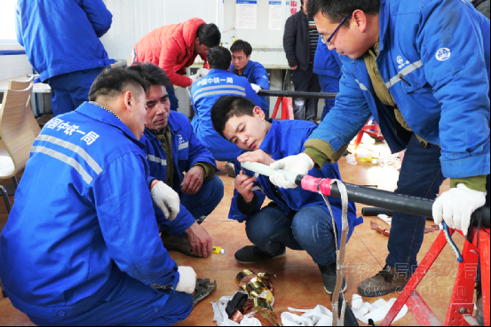 項目部利用管理層和作業班組集中食宿的優勢,以項目自有的多媒體會議室和工藝工法成品展覽室為培訓陣地,擇優選擇和安排施工經驗豐富的技術骨干授課。授課人結合現場實際,制作電子課件,既有圖文并茂的PPT,也有現場施工錄制的視頻。培訓將學、考、練相結合,每天早8點至晚6點,是聽課學習時間,次日上午為實操練習時間,下午2點至5點進行知識點理論考試,做到學有檢查,練有實效,真正達到培訓的目的。課程內容包括施工前勘查測量、基礎預埋件安裝,到接觸軌主材及輔材運輸、中間頭及終端頭制作,一次電纜頭制作、二次配線工藝、雜散電流監測等,幾乎涵蓋了地鐵變電所系統、環網系統、接觸軌牽引供電及均回流系統、雜散電流監測系統施工的全部工序。