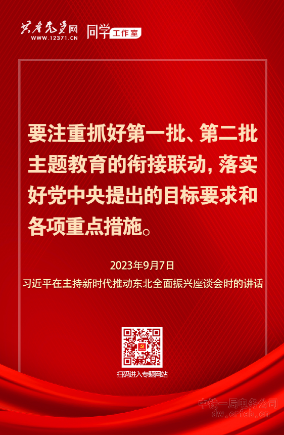 2023年9月7日,習近平總書記在主持召開新時代推動東北全面振興座談會時強調,要注重抓好第一批、第二批主題教育的銜接聯動,落實好黨中央提出的目標要求和各項重點措施。深化理論學習,用新時代中國特色社會主義思想凝心鑄魂,把黨員、干部的思想和行動統一到黨中央決策部署上來,增強信心、提振精神。大興調查研究,提高黨員、干部特別是領導干部科學謀劃工作、解決實際問題、抓好工作落實能力。著眼推動高質量發展,教育引導黨員、干部完整準確全面貫徹新發展理念,貫徹以人民為中心的發展思想,以科學態度和務實精神開創發展新局面。加強檢視整改,督促黨員、干部正視和解決黨性黨風黨紀方面的問題,以新風正氣振奮人民群眾發展信心。