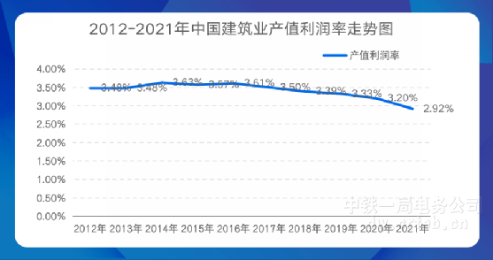建筑業產值利潤率自2014年達到最高值3.63%后,總體呈下坡趨勢。2021年,建筑業產值利潤率破3%,僅為2.92%,創近十年新低。