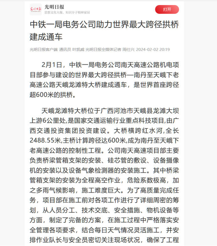 【光明日?qǐng)?bào)】中鐵一局電務(wù)公司助力世界最大跨徑拱橋建成通車