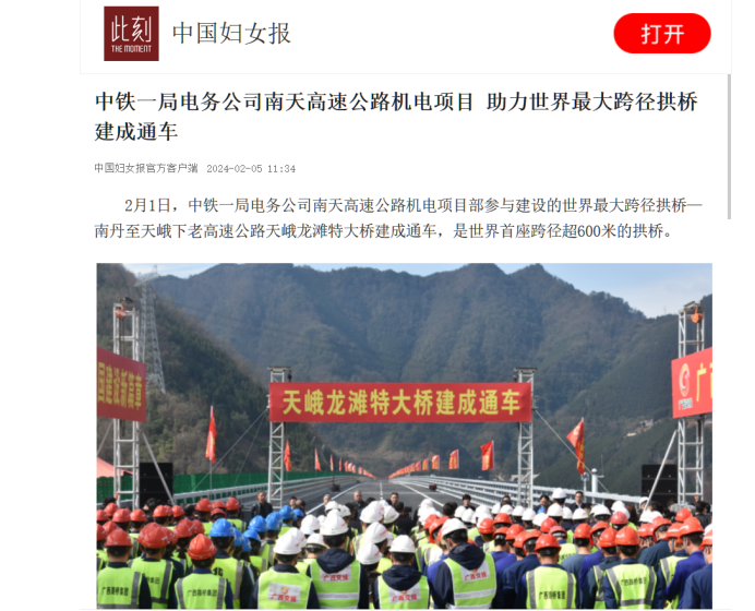 【中國婦女報】中鐵一局電務公司南天高速公路機電項目助力世界最大跨徑拱橋建成通車