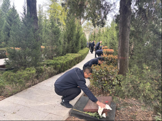 在黨總支書記李鵬的帶領下,全體人員在英烈廣場默哀一分鐘,深切緬懷那些為了國家獨立、民族解放而英勇獻身的英雄們。黨總支代表依次向烈士紀念碑敬獻花籃,仔細整理緞帶,每一個動作都表達了對先烈們的無限崇敬之情和永久懷念。“我志愿加入中國共產黨……”全體黨員在西十項目負責人孫權的帶領下,重溫入黨誓詞,鏗鏘有力的誓言響徹整個廣場,彰顯了每一位黨員不忘初心、牢記使命的決心與信念。隨后,黨員們分組走向各個烈士墓碑,開啟莊重的擦拭工作。每位黨員手持清潔布,認真細致地擦拭著每一塊墓碑,細心清除上面的灰塵后獻上一束鮮花。這一過程不僅是對烈士墓碑的清潔,更是對先烈們的深切緬懷與敬仰。許多黨員表示,通過親手擦拭墓碑,更加真切、深刻地體會到了革命先烈們偉大的犧牲精神,這種精神也將激勵自己在未來的工作和生活中,堅守初心,砥礪前行。