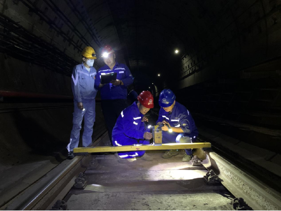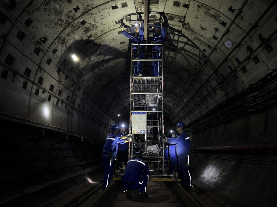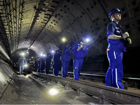 霜華伴月明,冬季上海市的霓虹燈光輝映著熙熙攘攘的街頭巷尾。與白天的喧囂不同,夜晚的地鐵隧道內更顯神秘與寧靜。這是一個城市的心臟,為居民提供安全、便捷的出行服務。在這個光影斑駁的城市夜晚,一群身穿藍色工作服、安全帽的小伙子按照施工方案有條不紊地進行檢修和維護。金屬撞擊聲、機械嗡鳴聲、大伙的交流聲交織在一起,構成一曲城市夜晚的交響樂。