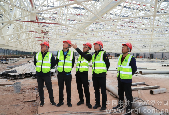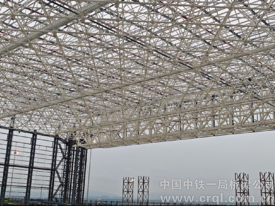 此次提升施工中,中鐵一局項目采用“超大型構件多點液壓同步提升技術”,先在地面完成網架、鋼桁架拼裝,再通過計算機控制20臺液壓提升站整體提升到位。各吊點理論提升力最大差異超10倍,同步控制難度較大。項目采用短程智能機控,分段復核精調的措施,歷時9小時,安全提升到位。該工藝大幅降低了高空作業的風險和難度,保障了結構整體穩定性與安裝精度。施工期間,中鐵一局八公司領導班子現場帶班,公司生產部門全程盯控指導,確保提升過程安全可控。
