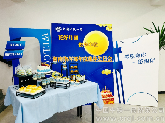 活動現(xiàn)場,指揮部被繽紛的氣球與精美的蛋糕裝點得格外溫馨。“花好月圓、悅享中秋”與“集體生日會”的主題標語交相輝映,營造出濃厚的節(jié)日氛圍與集體歡慶的喜悅。