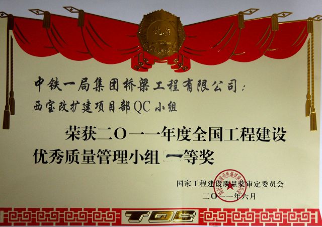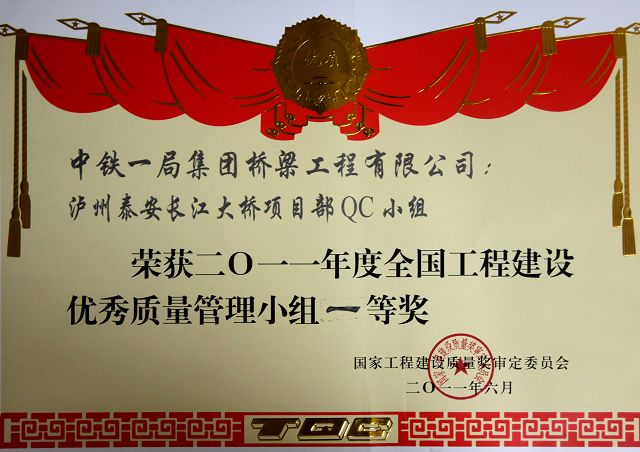 由橋梁工程公司選送參評的西安至寶雞高速公路改擴建工程阿房宮高架橋《提高樁基后壓漿合格率》和瀘州泰安長江大橋《研究大型塔吊高空拆除新方法》兩項成果,在與762項成果角逐中脫穎而出,經國家工程建設質量獎審定委員會審定,分別獲得2011年度全國工程建筑優秀質量管理小組一等獎。西寶項目部選送的《提高樁基后壓漿合格率》更是以小組第三名的優異成績直接進入了中國質量協會全國優秀質量管理獎的評審,并最終斬獲全國工程建設優秀質量管理小組一等獎的桂冠。