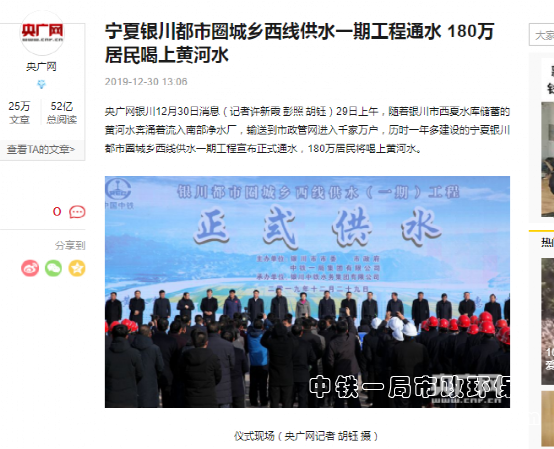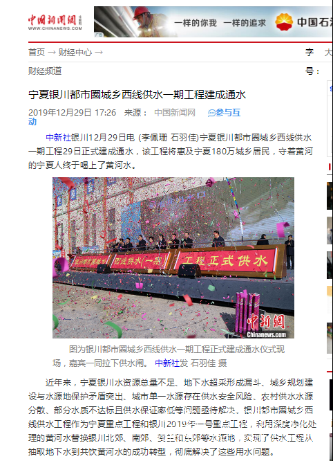 中國政府網報道:銀川都市圈城鄉西線供水工程項目通水