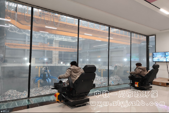 工作人員在操控垃圾吊抓斗投放垃圾