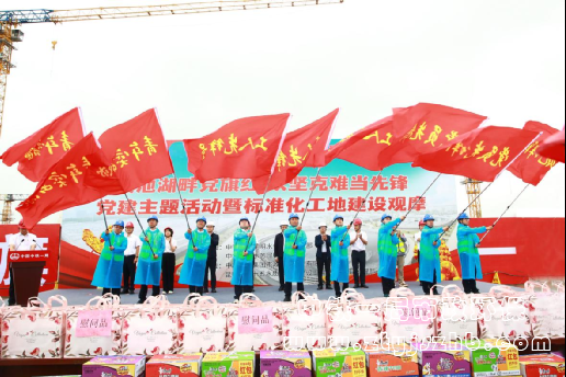 公司黨委副書記、工會主席張君一宣讀了開展“滇池湖畔黨旗紅 攻堅克難當先鋒”主題活動的決定,項目負責人作了表態發言。與會領導為項目黨員先鋒隊、工人先鋒號和青年突擊隊授旗,黨員先鋒隊、工人先鋒號和青年突擊隊進行了集體宣誓,并向全體黨員發出了活動倡議。全體與會人員深入施工現場,深入了解項目“滇池湖畔黨旗紅 攻堅克難當先鋒”黨建賦能工程,打造“黨建+”工作模式,以高質量黨建引領項目高質量建設的生動實踐,參觀了項目標準化工地建設及施工工藝,并觀摩學習項目標準化內業資料、標準化黨建資料,并圍繞項目黨建品牌建設深入探討交流。