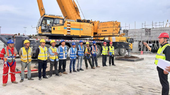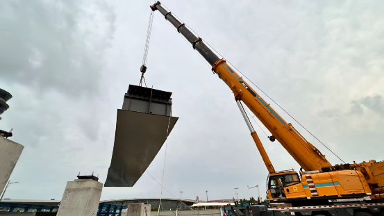 在工程推進中,作業(yè)點左側(cè)緊鄰機場運營中的交通要道,右側(cè)為施工便道,場地狹小、環(huán)境復(fù)雜。為保障作業(yè)萬無一失,施工團隊以“精細化管控”為核心,結(jié)合現(xiàn)場實際反復(fù)推演吊裝方案,對設(shè)備選型、吊點設(shè)置、應(yīng)急預(yù)案等環(huán)節(jié)逐一優(yōu)化;施工期間實時跟進節(jié)點進度,從構(gòu)件進場檢驗到吊裝精度校準(zhǔn),每一步均落實質(zhì)量與安全雙管控,實現(xiàn)首節(jié)段幾乎零偏差安裝。