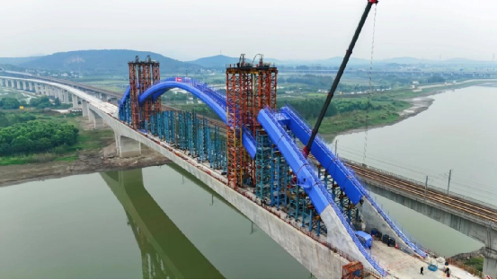 這座全長400米的提籃拱橋,以6度內傾弧線,在河面上勾勒出“藍色巨蝶”的優雅姿態。然而,美麗的外表下隱藏著巨大的挑戰——傳統的原位支架法會危及旁邊高速鐵路的運行安全。面對這個難題,技術團隊以“四兩撥千斤”的智慧,為這座特殊的橋梁量身定制了“邊拱肋原位拼裝+中拱肋低位拼裝后豎向提升”的全新方案。