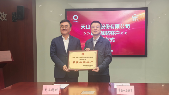 隨后,張海龍與劉宗虎分別代表雙方簽署戰略合作協議。天山材料向物貿公司授予“2025年度最佳戰略客戶”榮譽獎牌。