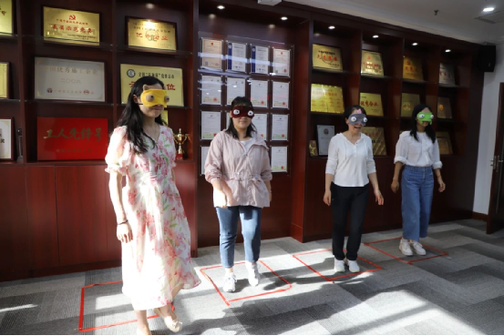 在 “原地踏步走” 游戲中,4名職工站成一排,隨著音樂的節奏在規定區域內踏步。當音樂戛然而止,工作人員“最近距離者” 收獲一份小獎品。五輪游戲下來,現場笑聲不斷,大家在比拼中放松了身心,也增進了彼此間的互動。