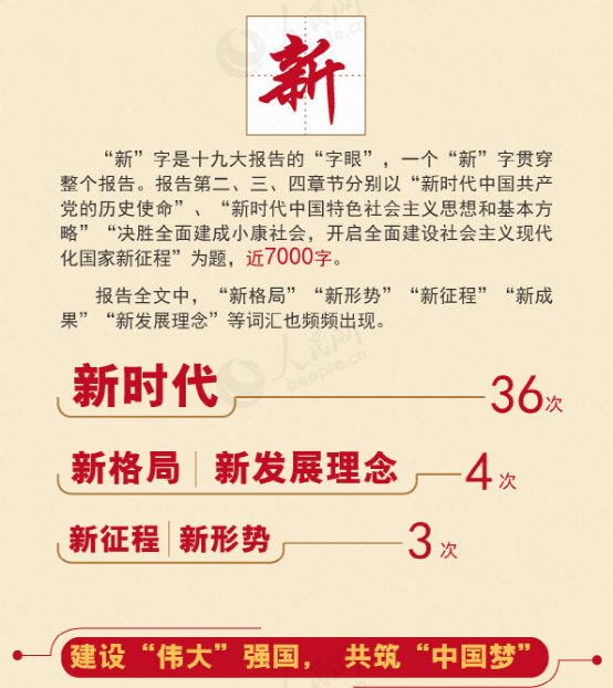“新”字是十九大報(bào)告的“字眼”,一個(gè)“新”字貫穿整個(gè)報(bào)告。報(bào)告第二、三、四章節(jié)分別以“新時(shí)代中國(guó)共產(chǎn)黨的歷史使命”、“新時(shí)代中國(guó)特色社會(huì)主義思想和基本方略”“決勝全面建成小康社會(huì),開(kāi)啟全面建設(shè)社會(huì)主義現(xiàn)代化國(guó)家新征程”為題,近7000字。