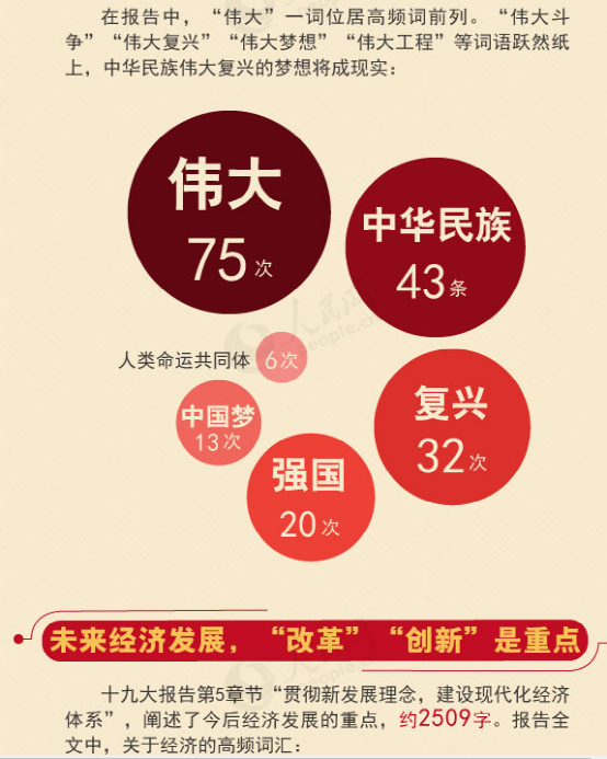 在報(bào)告中,“偉大”一詞位居高頻詞前列。“偉大斗爭(zhēng)”“偉大復(fù)興”“偉大夢(mèng)想”“偉大工程”等詞語(yǔ)躍然紙上,中華民族偉大復(fù)興的夢(mèng)想將成現(xiàn)實(shí):