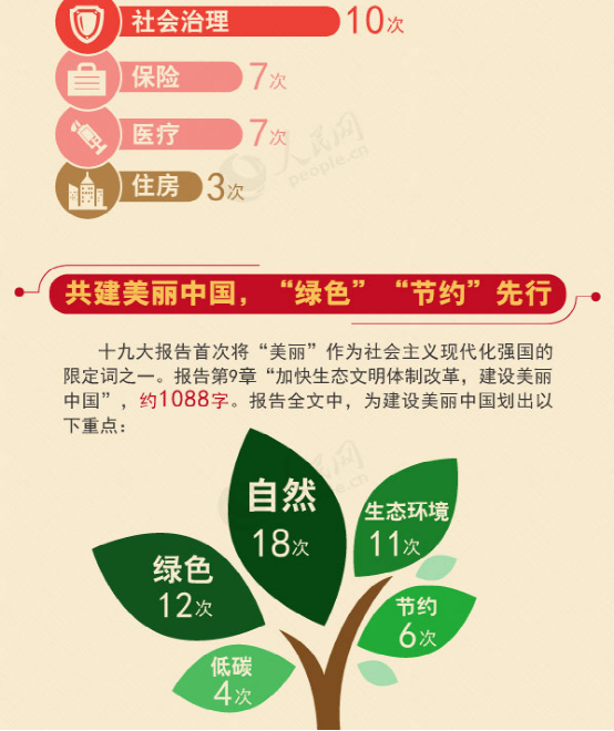 十九大報(bào)告首次將“美麗”作為社會(huì)主義現(xiàn)代化強(qiáng)國(guó)的限定詞之一。報(bào)告第9章“加快生態(tài)文明體制改革,建設(shè)美麗中國(guó)”,共1088字。報(bào)告全文中,為建設(shè)美麗中國(guó)劃出以下重點(diǎn):