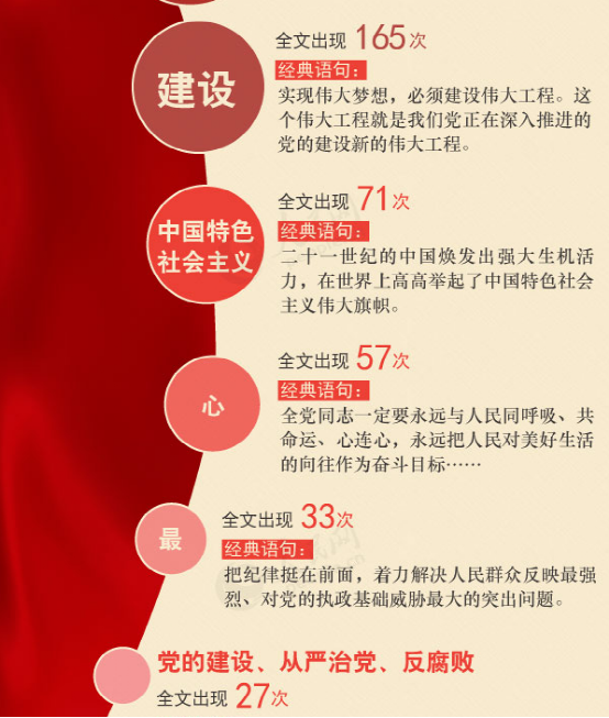 偉大75次,中華民族43條,復(fù)興32次,強(qiáng)國(guó)20次,中國(guó)夢(mèng)13次,人類命運(yùn)共同體6次。