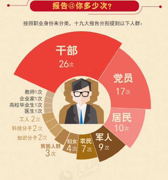 干部26次,黨員17次,居民10次,軍人9次,農(nóng)民7次,婦女4次,貧困人群3次,知識(shí)分子2次,科技分子2次,工人2次,醫(yī)生1次,高校畢業(yè)生1次,企業(yè)家1次、教師1次。