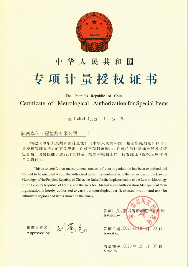 可承擔除大型水利工程(含一級堤防)主要建筑物以外的其他各等級水利工程的混凝土工程、巖土工程和量測類質量檢測業務。 水利工程質量檢測單位資質等級證書
